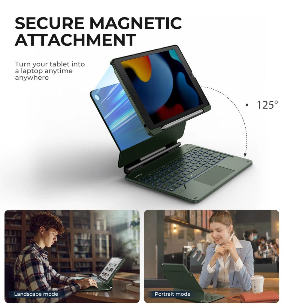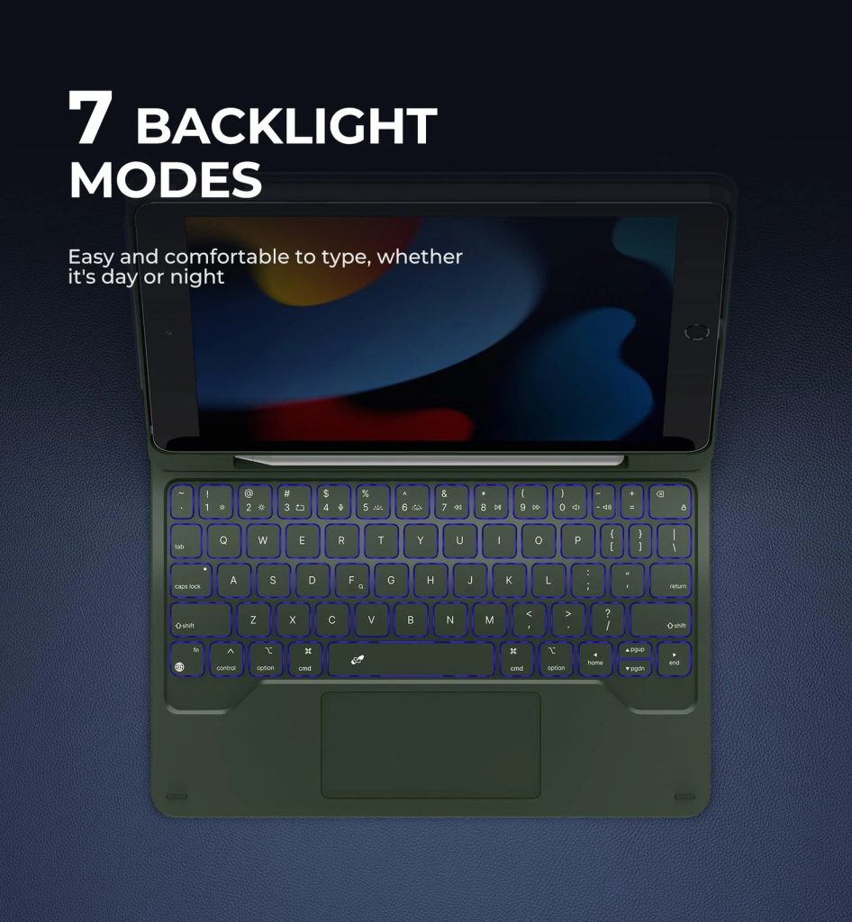 Verleihen Sie Ihrem iPad eine neue Dimension mit dieser stilvollen und praktischen Hülle mit Tastatur! Dank magnetischem Ständer, integriertem Trackpad und beleuchteten Tasten erhalten Sie maximalen Komfort beim Tippen, Betrachten von Inhalten und Arbeiten unterwegs.