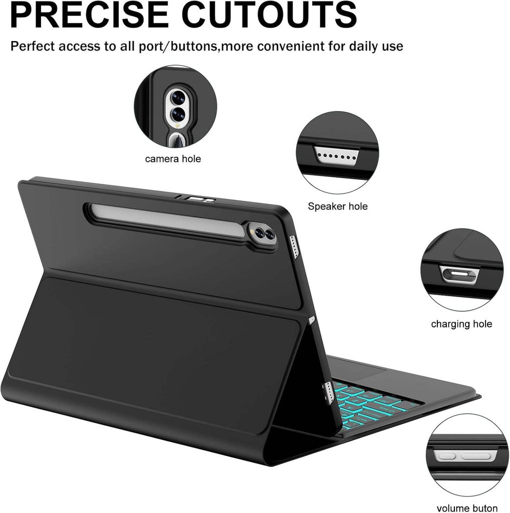 Die Hülle ist mit einer schützenden TPU-Rückabdeckung ausgestattet, die Stöße dämpft und gleichzeitig den Zugang zu allen Bedienelementen ermöglicht. Die Tastatur ist magnetisch und abnehmbar, sodass sie auch separat verwendet werden kann. Der stabile Ständer ermöglicht eine bequeme Einstellung des Display-Winkels beim Arbeiten und beim Ansehen von Inhalten.