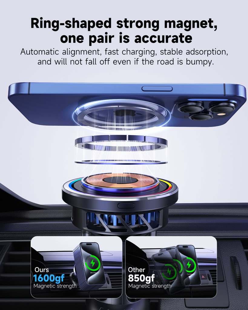 Dieser kühlende MagSafe Qi2 Halter kombiniert moderne kabellose Ladetechnologie mit einem fortschrittlichen Kühlsystem, das dafür sorgt, dass Ihr Telefon und das Ladegerät während des Ladens bei optimaler Temperatur bleiben. Dank des integrierten Halbleiter-Kühlchips und Luftventilators reguliert der Halter automatisch die Temperatur, verhindert Überhitzung des Geräts und gewährleistet schnelles und stabiles kabelloses Laden mit 15W Leistung.
