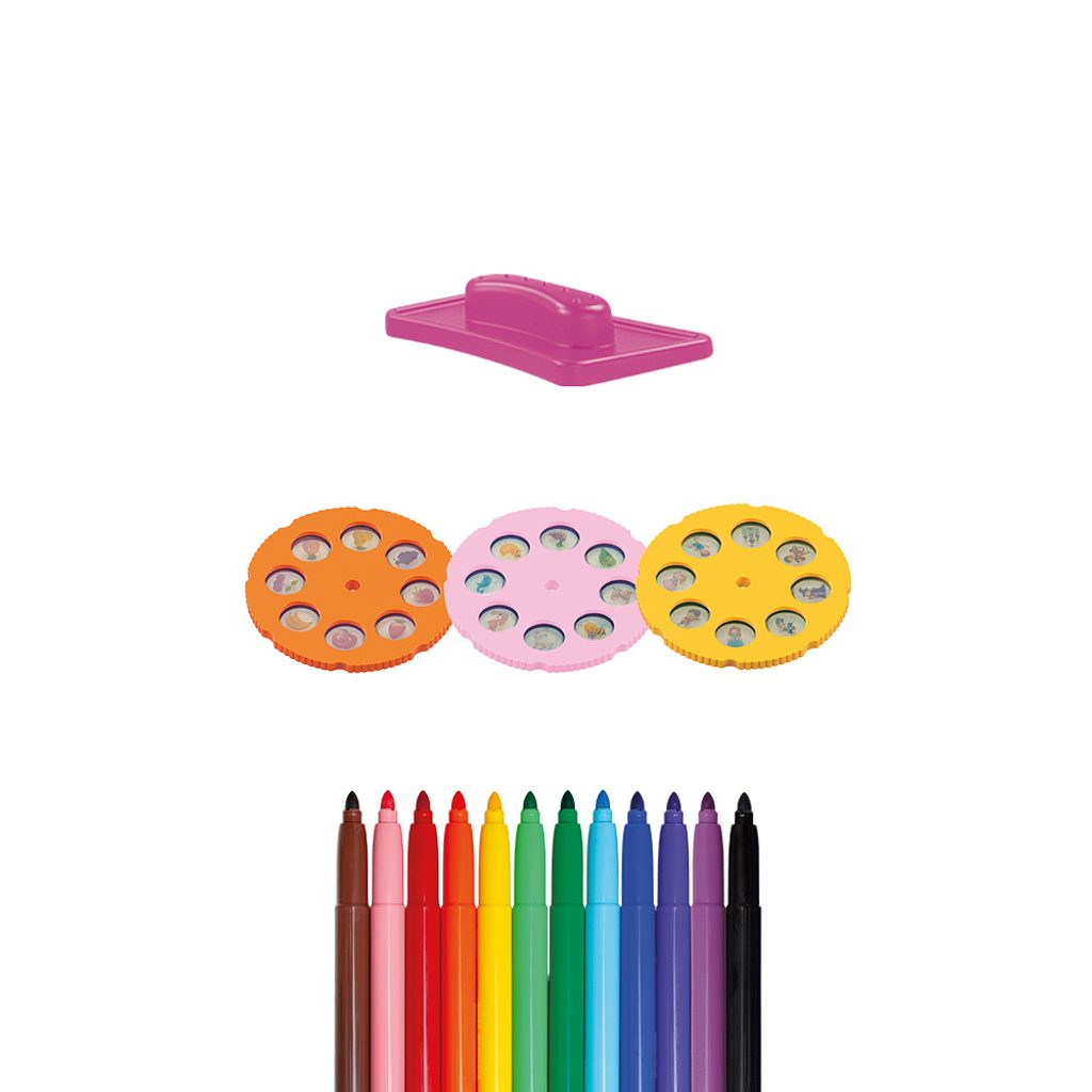 Die Tischplatte ermöglicht direktes Malen und die Bilder lassen sich einfach mit einem Schwämmchen abwischen. Der Projektor wird mit 2× AA-Batterien betrieben (nicht im Lieferumfang enthalten).