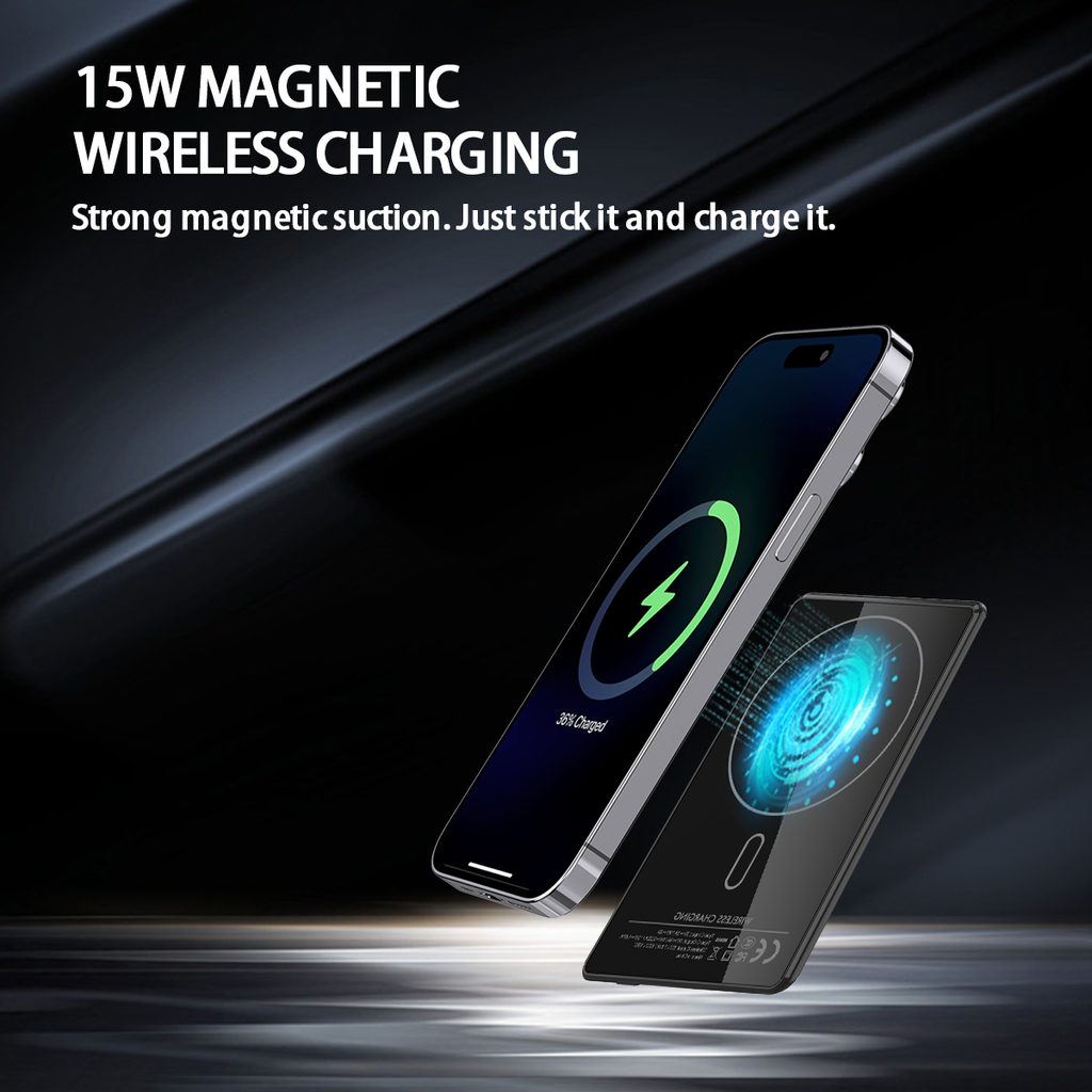 Diese extrem dünne und elegante MagSafe Powerbank mit 5000 mAh Kapazität ist für Nutzer konzipiert, die maximale Praktikabilität, absolute Mobilität und die Möglichkeit wollen, auch Apple-Geräte zu laden – einschließlich der Apple Watch. Das Gehäuse aus Metall und gehärtetem Glas wirkt hochwertig, ist kratzfest und sieht am Telefon luxuriös aus.
